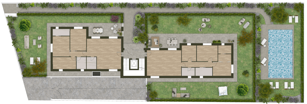 Il Residence Eblok si sviluppa su un lotto edificabile di 1230 mq e prevede la costruzione di 6 unità abitative moderne e funzionali:
