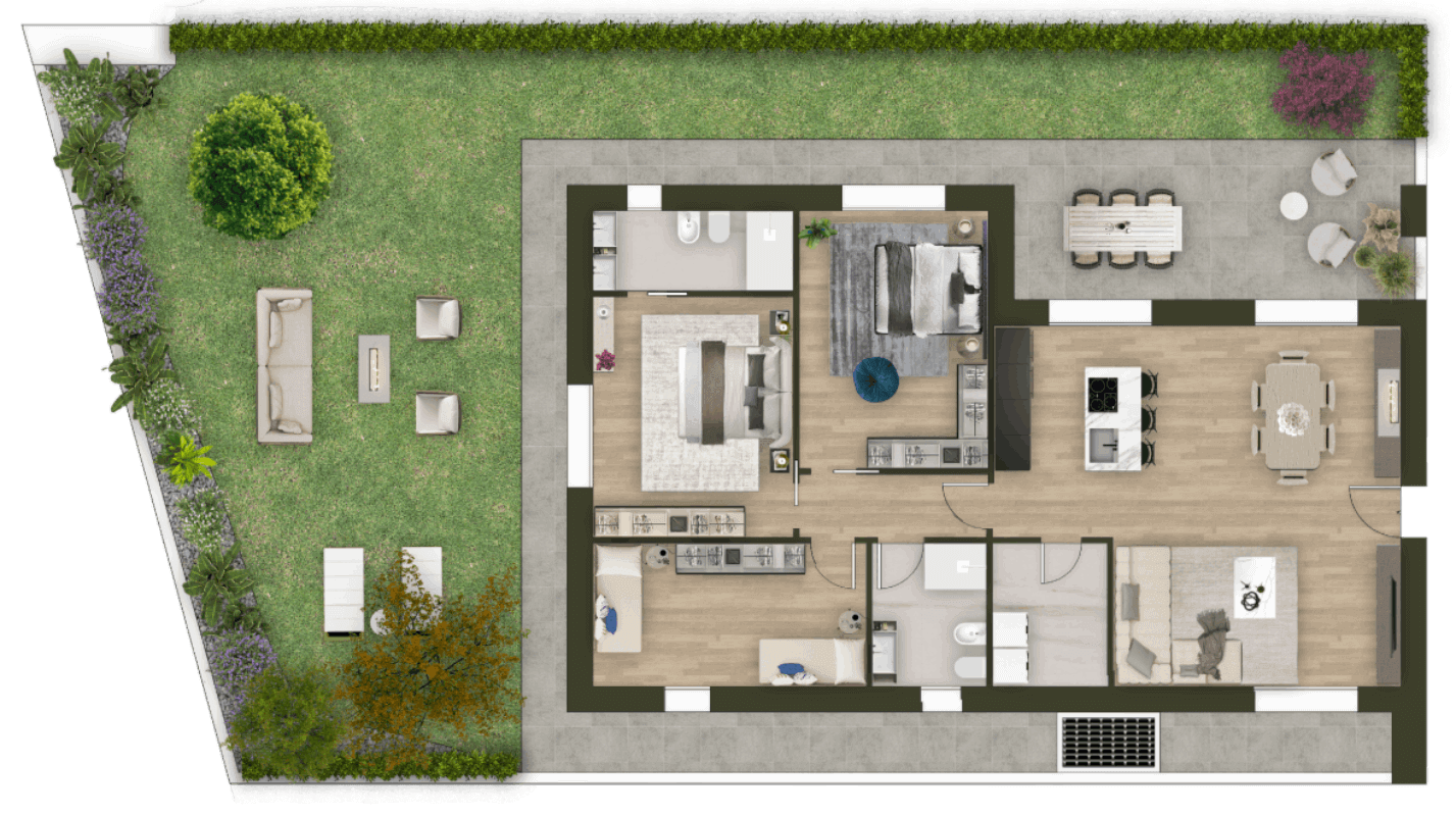 Ogni appartamento è progettato per offrire il massimo comfort, con finiture di alta qualità, spazi ampi e luminosi e un’attenzione particolare all’estetica e alla funzionalità. I garage doppi interrati garantiscono praticità e sicurezza, mentre la piscina del residence offre un’oasi di relax e svago esclusiva.