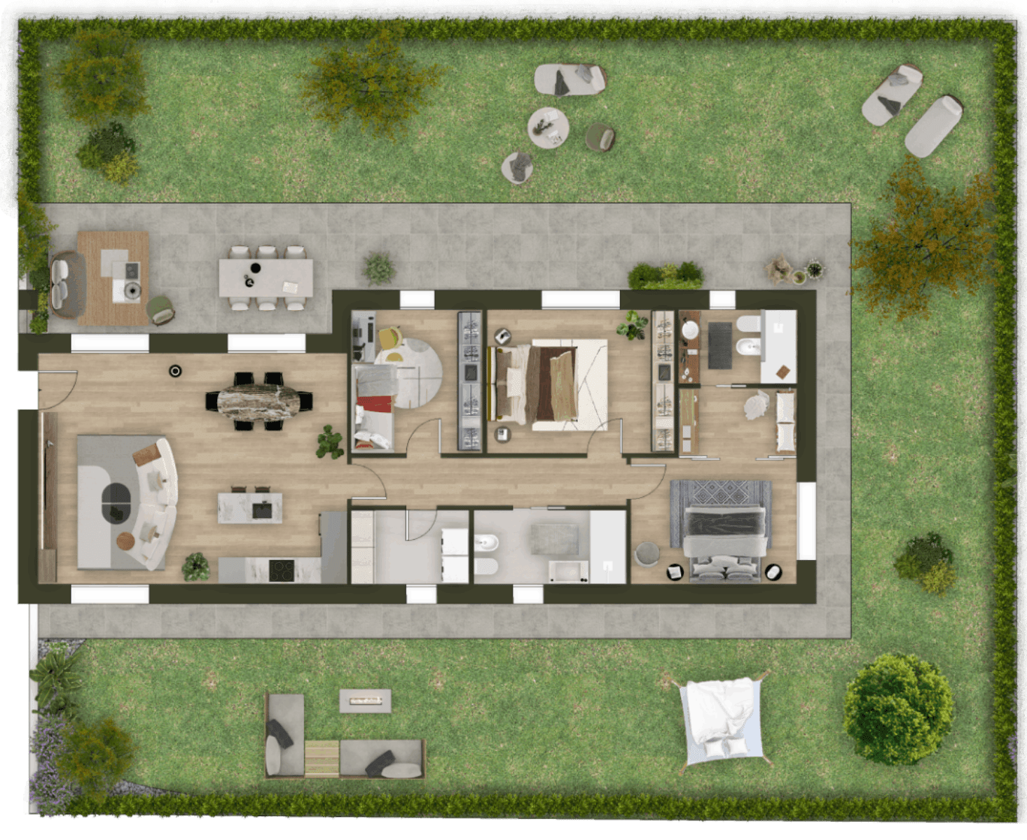 - 4 quadrilocali, composti da un’ampia area soggiorno, 3 camere matrimoniali, 2 bagni e lavanderia.