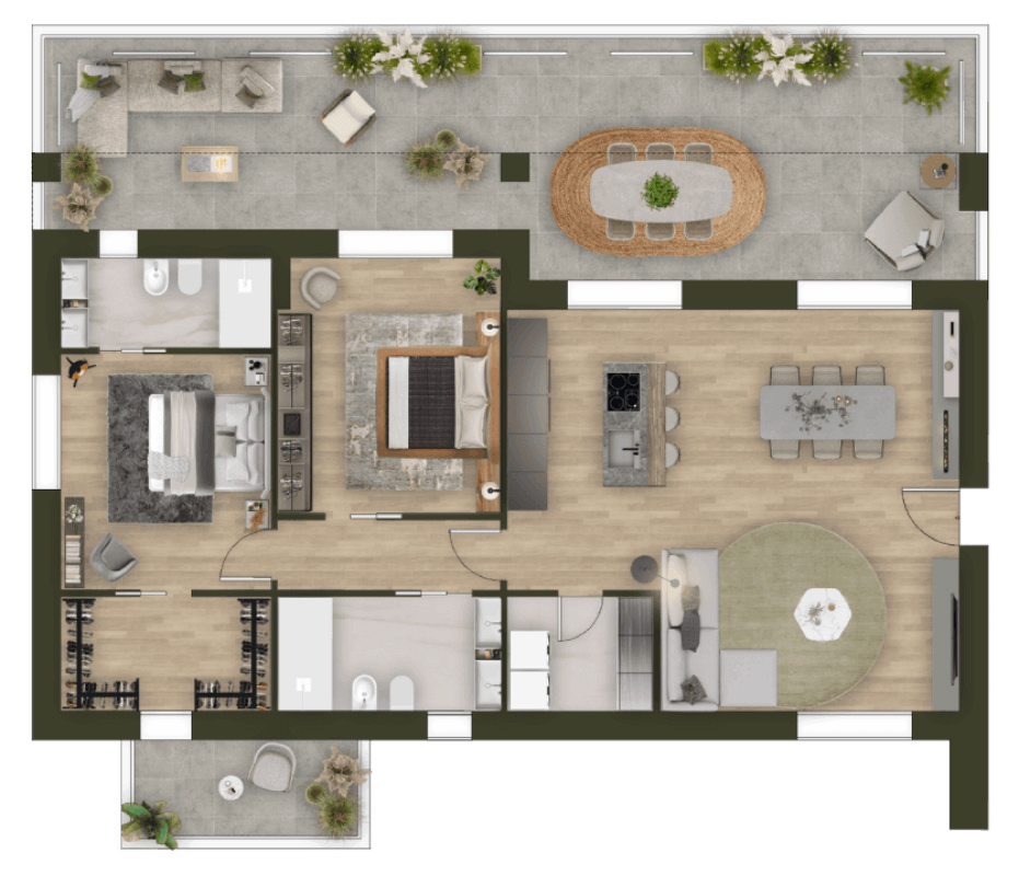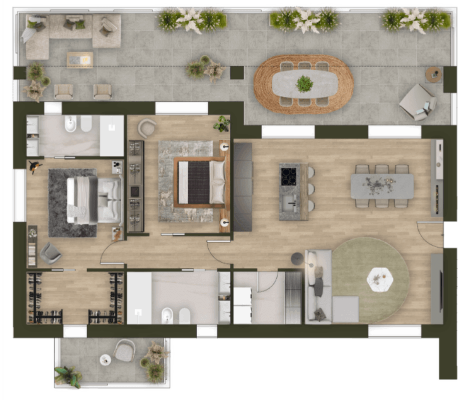 - 2 trilocali, caratterizzati da una spaziosa zona giorno, 2 camere matrimoniali, 2 bagni e lavanderia.